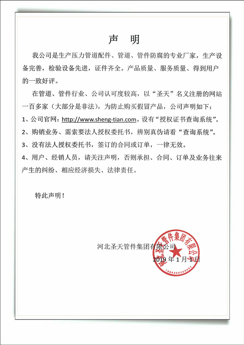 網站提示:本網站是河北圣天管件集團有限公司對外正式網站,本站提供所有對外業務授權書的查詢,本集團開出的所有授權書均可在線查詢,對于未在本站查詢到的授權書,本集團不予以認可,不承擔為此產生的法律責任。